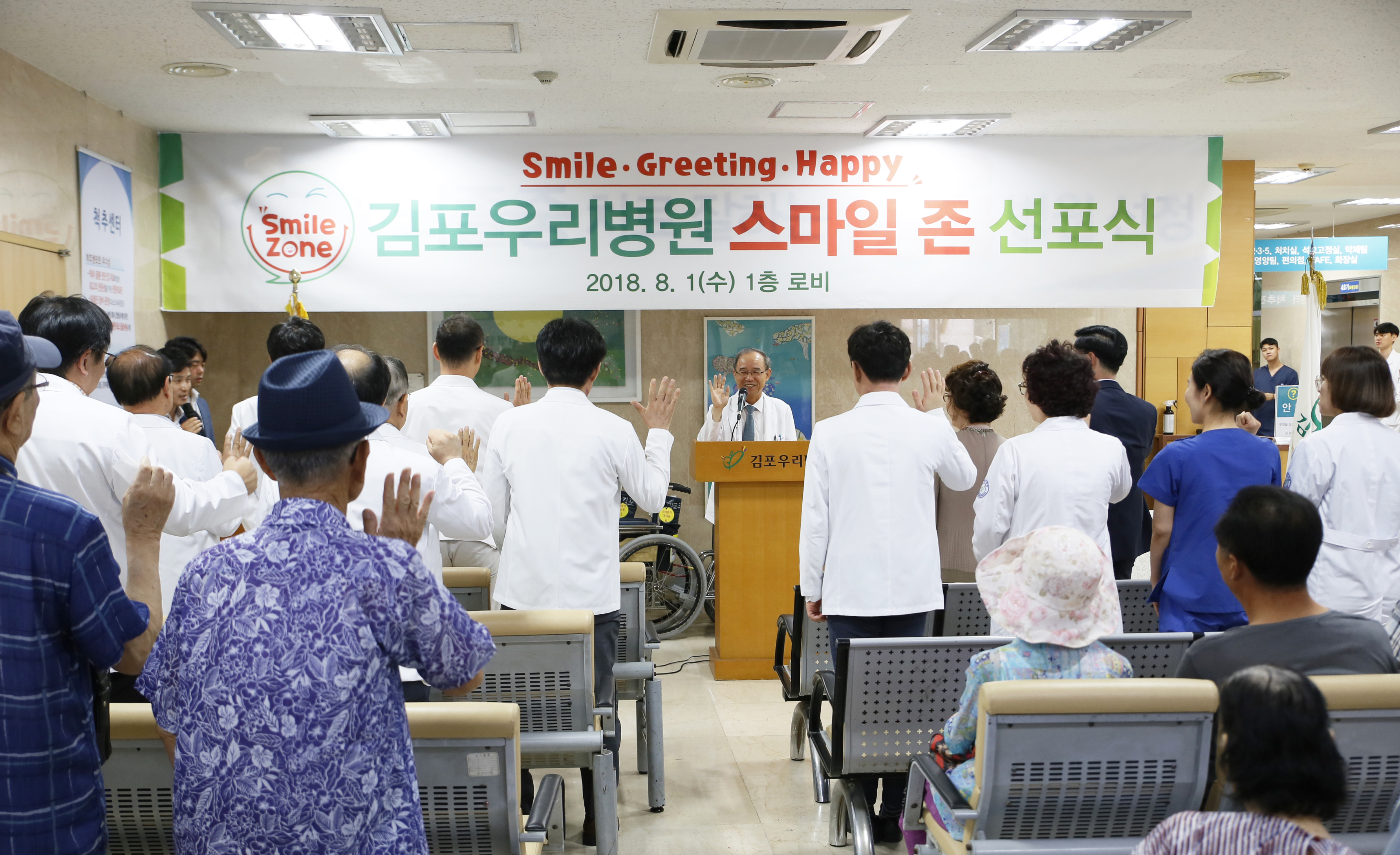 의료법인 우리의료재단 김포우리병원(병원장 고성백)은 지난 1일 1층 로비에서 전 직원이 참여한 가운데 스마일존(Smile Zone) 선포식을 진행하였다. 스마일존은 “웃으며 인사하면 행복해진다”는 의미를 담아 “SMILE(미소)”, “GREETING(인사)”, “HAPPINESS(..
