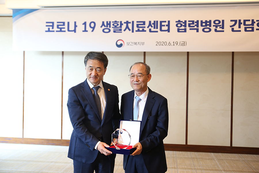 김포우리병원이 코로나19 환자치료를 위한 생활치료센터 의료지원단 파견 등의 공로를 인정받아 보건복지부 장관으로부터 감사패를 받았다. 박능후 보건복지부 장관은 지난 19일 서울 웨스턴조선호텔에서 열린 생활치료센터 지원의료기관장 간담회에서 고성백(오른쪽) 김포우리병원장에게 감사패를 전달..