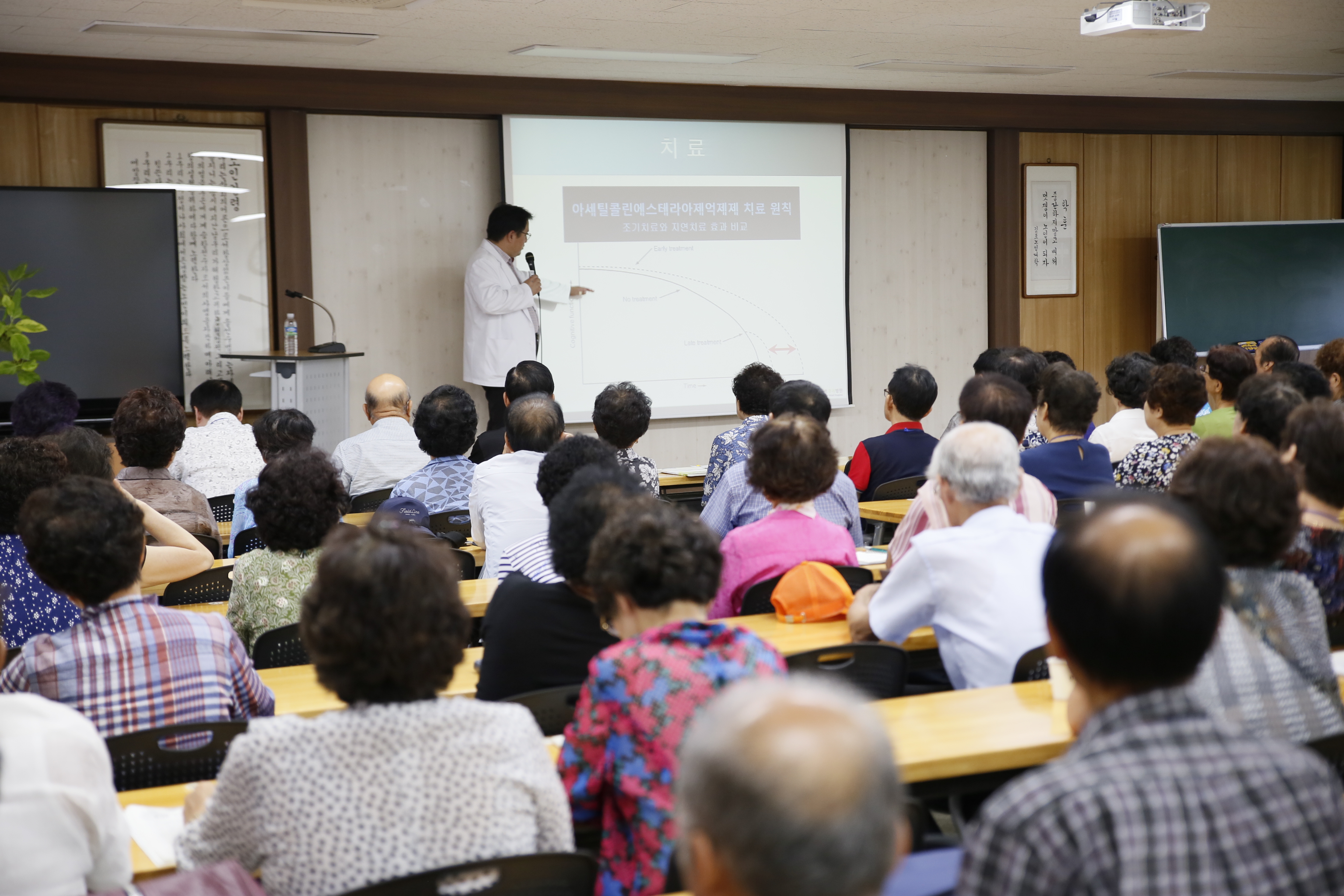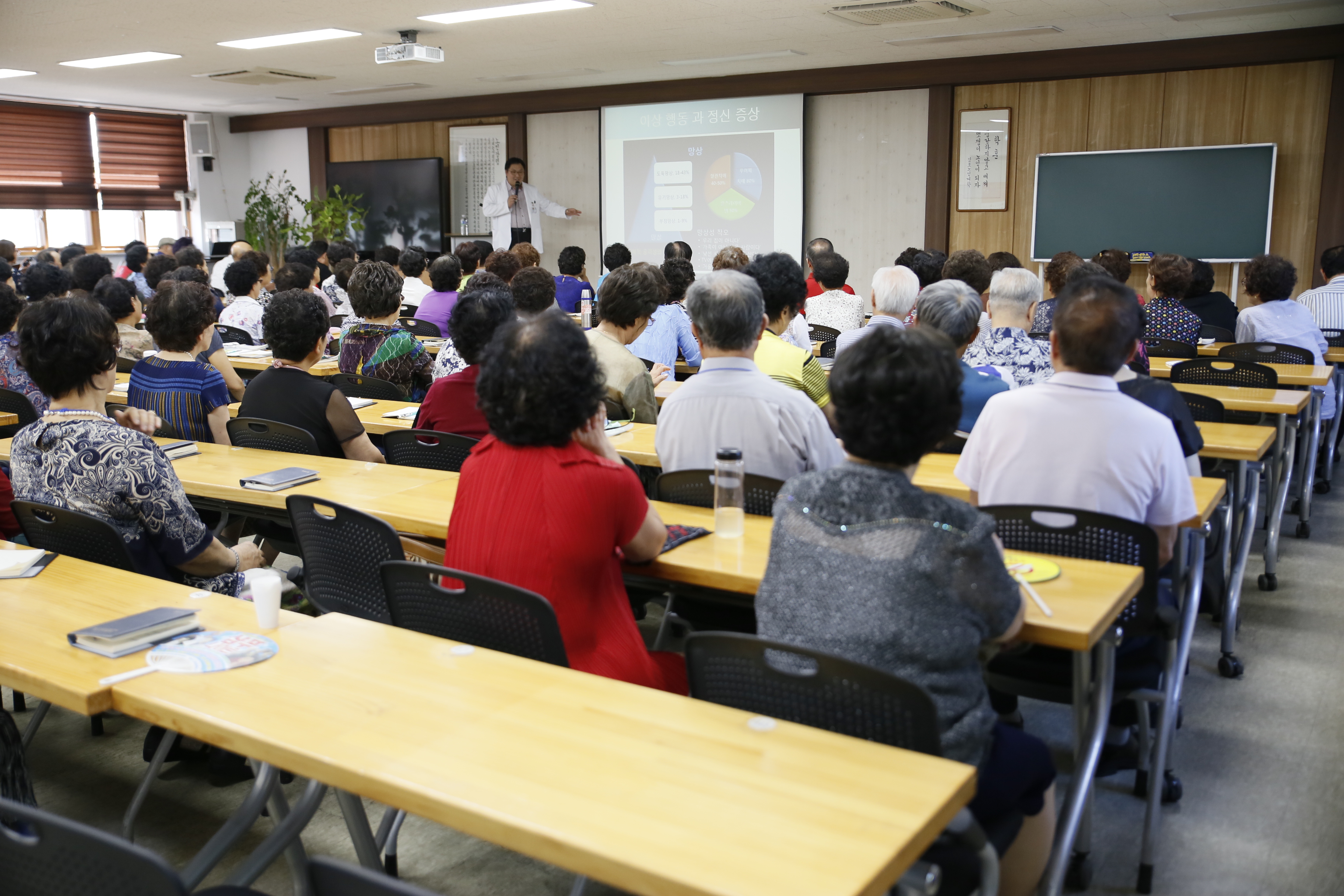 여기서 인지 기능이란 기억력, 언어 능력, 시공간 파악 능력, 판단력 및 추상적 사고력 등 다양한 지적 능력을 가리키는 것으로 각 인지기능은 특정 뇌 부위와 밀접한 관련이 있습니다. 의학 용어를 사용한다면 특정 증상들의 집합인 하나의 ‘증후군’에 해당되는 것으로 이러한 치매라는 임상 증후군을 유발하는 원인 질환은 세분화할 경우 70여 가지에 이릅니다. 다양한 치매 원인 질환들 중에서 가장 많은 것은 ‘알츠하이머병’과 ‘혈관성 치매’ 이지만, 그 밖에도 루이체 치매, 전측두엽 퇴행, 파킨슨병 등의 퇴행성 뇌질환들과 정상압 뇌수두증, 두부 외상, 뇌종양, 대사성 질환, 결핍성 질환, 중독성 질환, 감염성 질환 등 매우 다양한 원인 질환에 의해 치매가 발생할 수 있습니다. 평소에 생활습관 건강관리를 꾸준히하여 치매 예방에 도움 되는 운동을 하는 것이 좋다고 강의하였습니다.