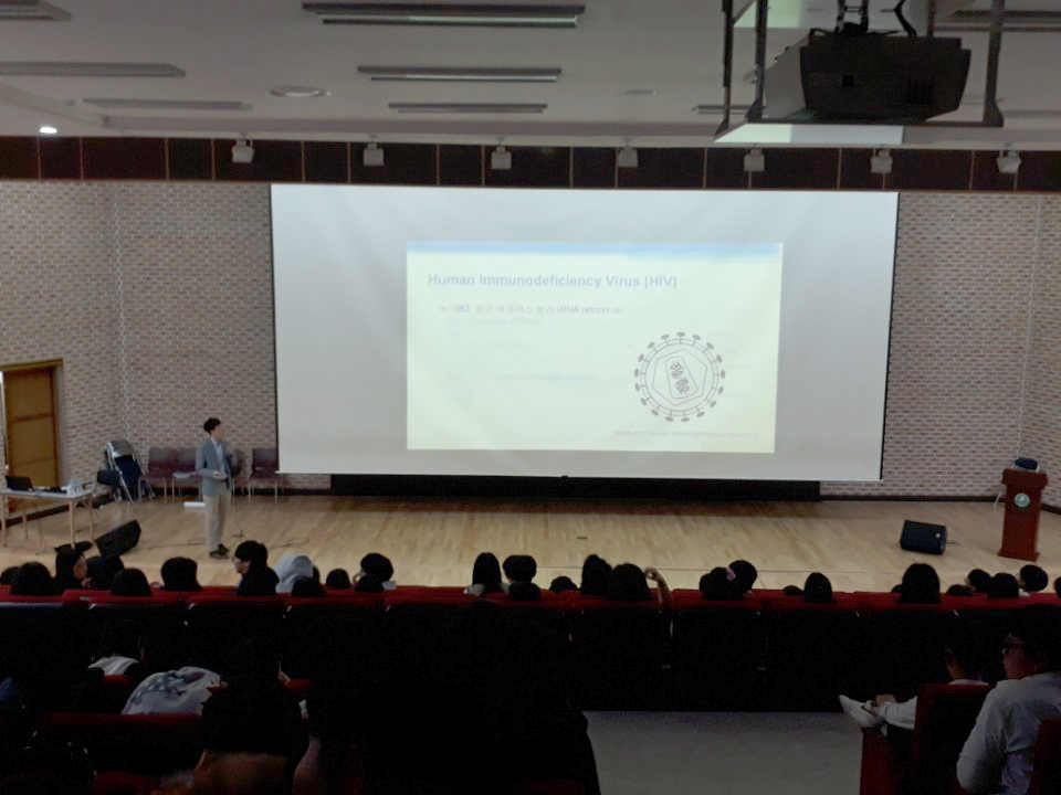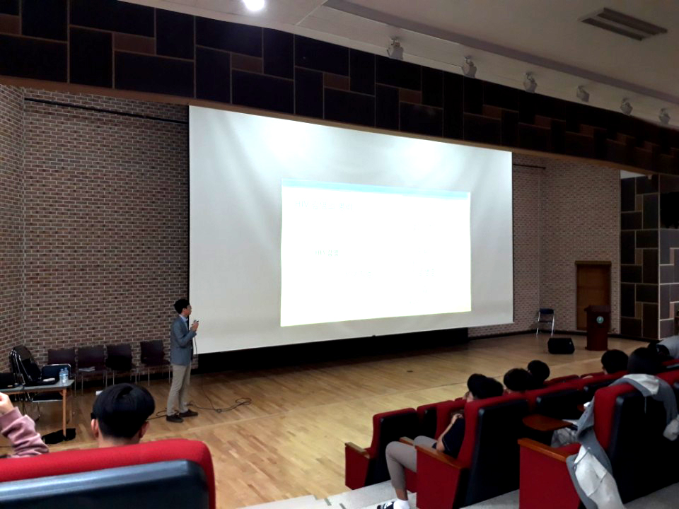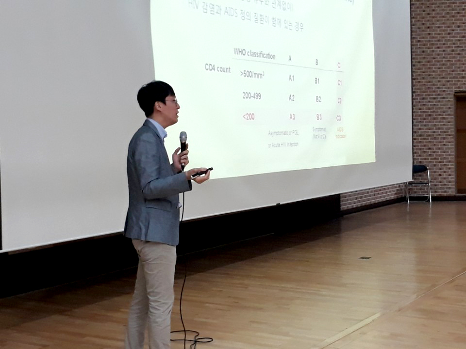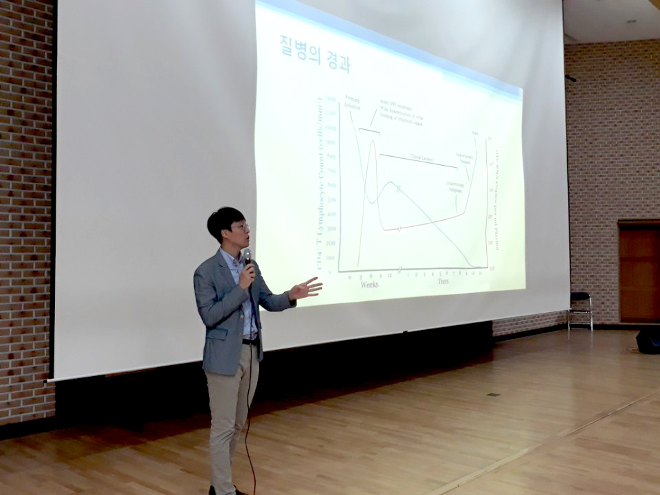 에이즈 감염 예방교육 다양한 에으즈 원인 질환들 중에서 가장 많은 것은 ‘후천성면역결핍증’으로 병원체인 HIV(Human Immunodeficiency Virus), 즉 ‘인간면역결핍 바이러스’에 감염돼 체내의 면역 기능이 저하되어 사망에까지 이르는 일종의 전염병으로 에이즈는 1981년에 최초로 세상에 알려졌으며, 한번 발병하면 소나무를 100% 말라죽게 하는 소나무재선충병을 ‘소나무 에이즈’라고 부르는 것처럼 이제 에이즈는 치명적인 병의 상징이 되었습니다. 현재 HIV 치료의 중심이 되고 있는 것은 HAART라고 불리는 다제병용요법, HAART(highly active antiretroviral therapy)란 항HIV제를 3제 이상 병용하는 강력한 다제병용요법을 말하는데요. HAART 보급 이후 HIV 감염자의 생명예후는 현저하게 개선되었습니다. 개인이 건전한 생활을 하고, 병원이 혈액 관리를 철저하게 예방하면 막을 수 있다고 강의하였습니다.