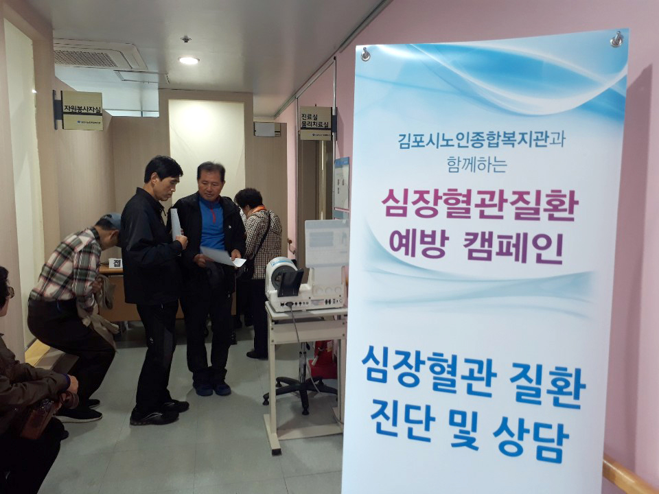 "김포시노인복지회관과 함께하는 심장혈관질환 예방 캠페인" 지난 11일 김포시노인복지회관에서 어르신을 위한 심장혈관질환 진료와 상담을 실시하였습니다. 이날 50여분의 어르신들이 참석한 가운데 김포우리병원 순환기내과 정승묵 과장은 김포시노인종합복지관을 방문하여 어르신들을 대상으로 심장혈관질환 무료 진료를 실시하였습니다.
