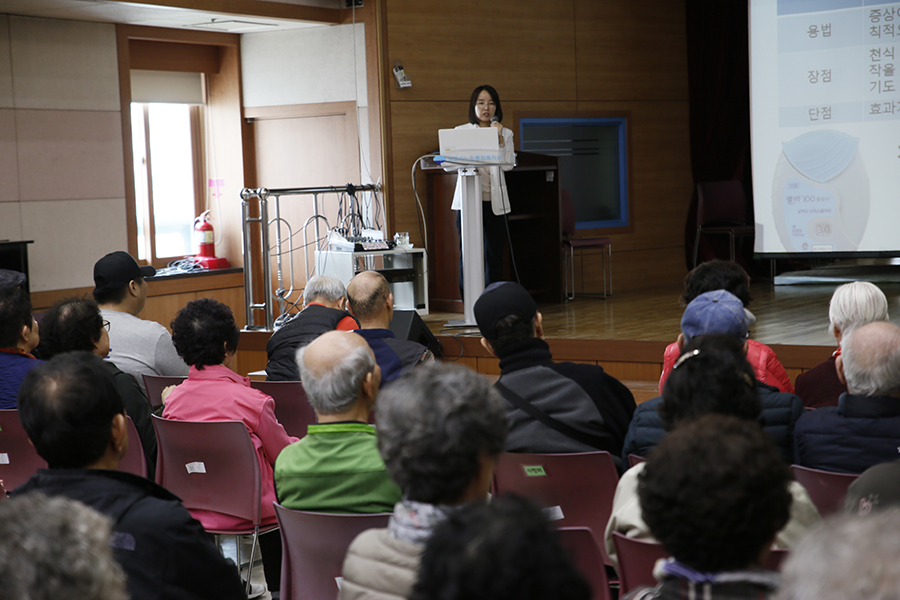 천식으로 진단된 환자들에게는 약물요법과 회피요법, 필요한 경우 면역치료 등을 시행합니다. "천식 등 호흡기 질환과 늘어나는 미세먼지로 외출 시 꼭 마스크를 착용해야 하며 청결을 유지, 영양소 섭취 관리가 중요" 하다고 내용을 강조하였습니다. 이번 건강강좌를 통하여 어르신들의 호흡기질환에 대해 더 잘 알고, 더 잘 이해할 수 있었던 유익한 시간이 되었습니다. |