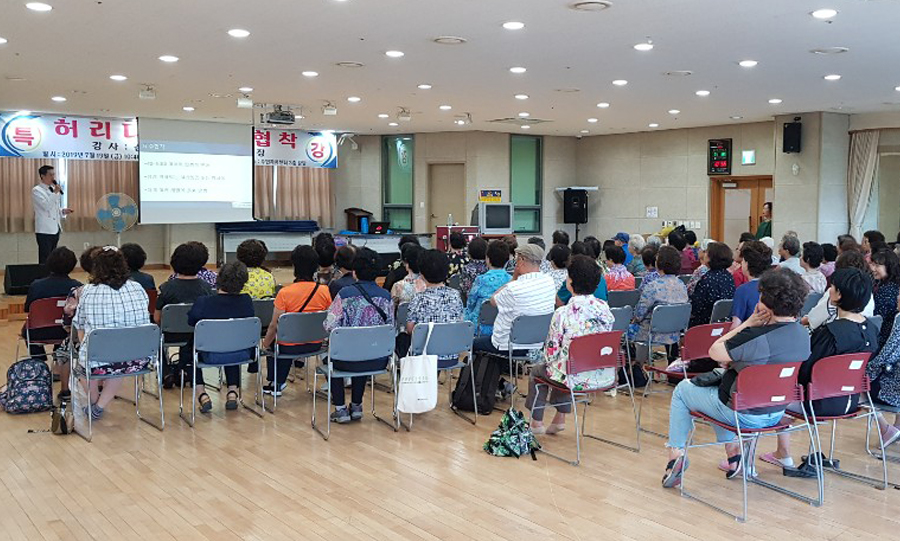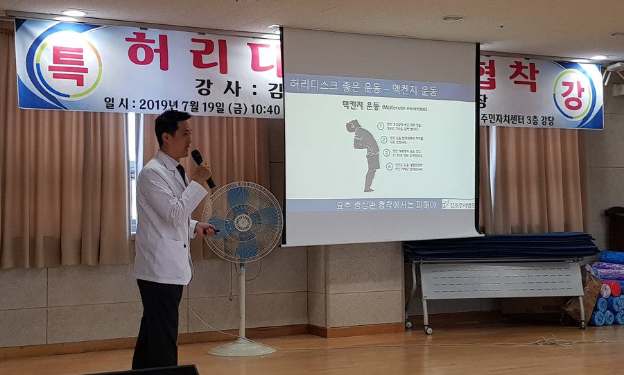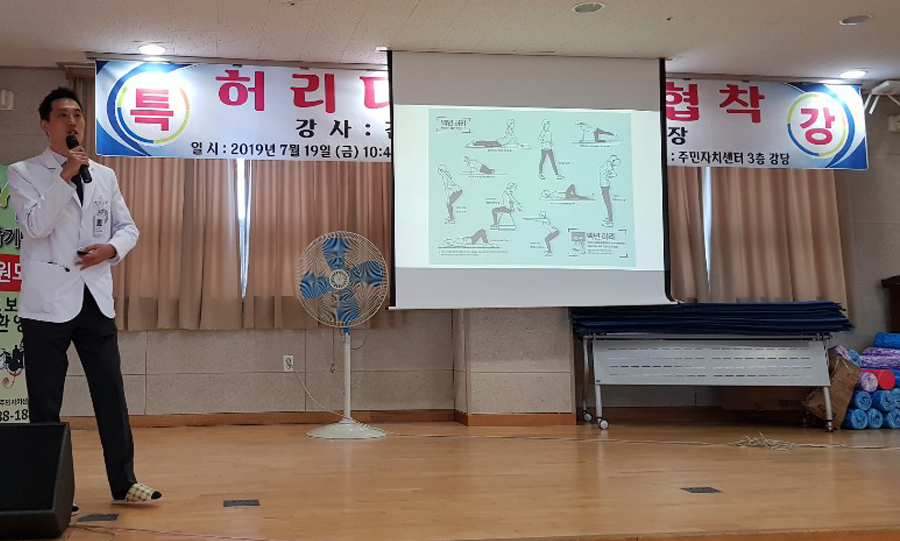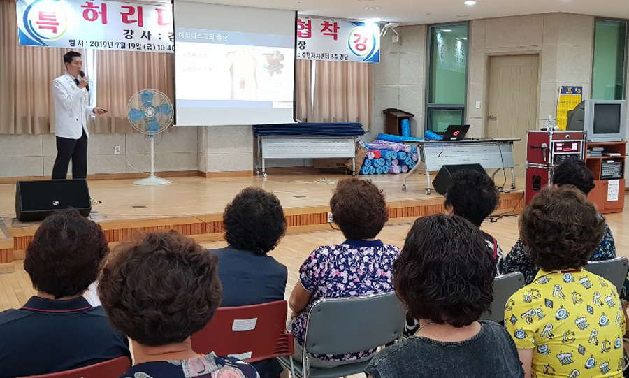 지난 19일 김포우리병원 재활의학과 강중모 과장은 하성면 주민자치회에서 90여명의 어르신이 참여한 가운데 "요통(허리디스크 & 협착)"을 주제로 건강강좌를 개최하여 큰 호응을 얻었습니다.