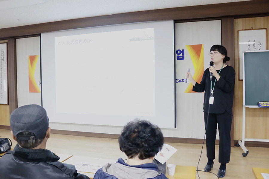 노년기에 식습관 관리가 중요한 만큼 당류가 많이 함류 된 가공식품 등을 섭취하게 되면 당뇨나, 고혈압의 원인이 되므로 위험요소를 인지하고 그동안 잘 못 알고 있던 식습관에 대해 알기쉽고 명쾌한 설명을 통해 어르신들이 건강한 식습관을 실천하여 당뇨병, 고혈압등 만성질환을 관리 및 심장혈관질환을 예방, 건강한 생활에 도움을 드릴 수 있는 유익한 시간이 되었습니다. |