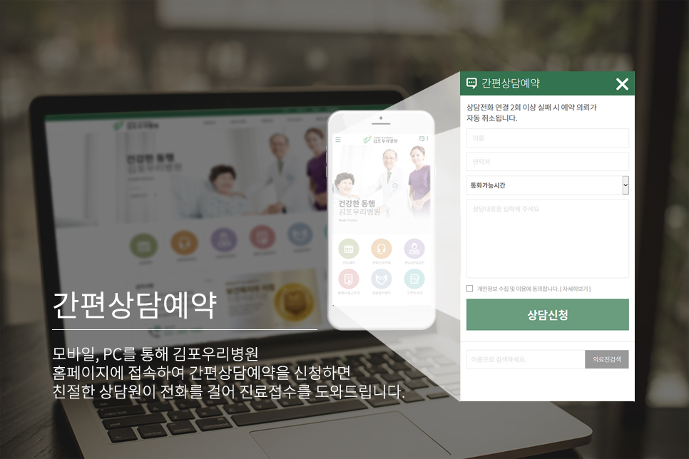 ![]() 김포우리병원은 환자분들이 보다 편리하게 진료서비스를 이용하실 수 있도록 온라인 간편상담예약 서비스를 시행합니다. 간편상담예약 서비스 이용방법은 PC, 모바일을 통해 김포우리병원 홈페이지에 접속하여 번거로운 회원가입 절차 없이 이름, 연락처를 남기시면 콜센터의 전문 상담원이 전화를 걸어 진료 접수를 도와드립니다. |