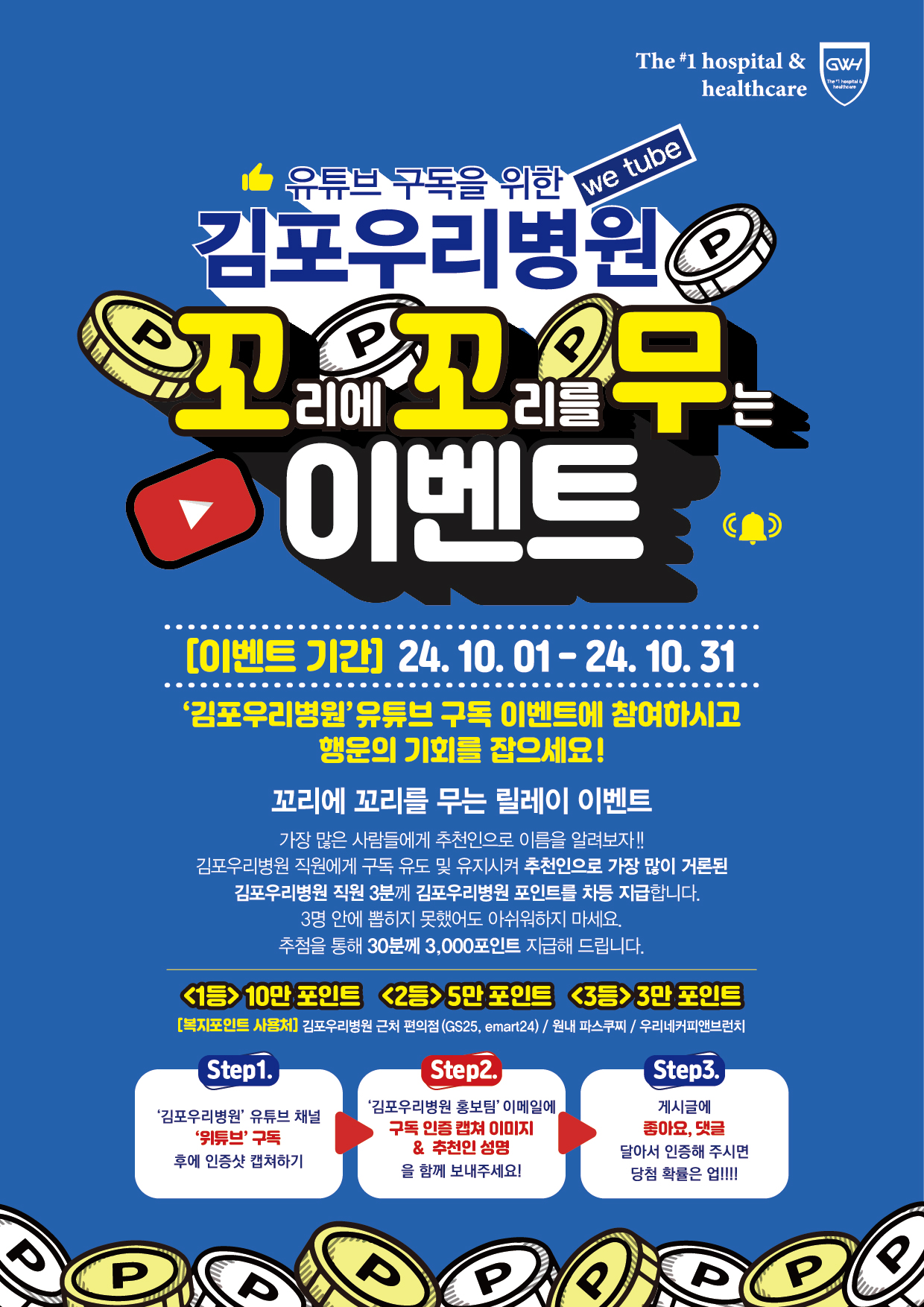 ![]() ‘김포우리병원’유튜브 구독 이벤트에 참여하시고 행운의 기회를 잡으세요! 대상_김포우리병원 직원이면 누구나 참여 가능 기간_2024년 10월 1일-2024년 10월 31일 자세한 참여 방법은 김포우리병원 블로그 https://blog.naver.com/gwhospital07/223597145818 또는 그룹웨어 공지사항을 참고하세요 직원 여러분의 많은 참여 부탁드립니다