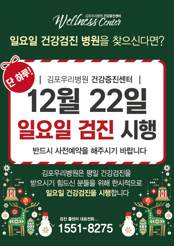 김포우리병원 건강증진센터 12월 22일 일요일 검진 시행