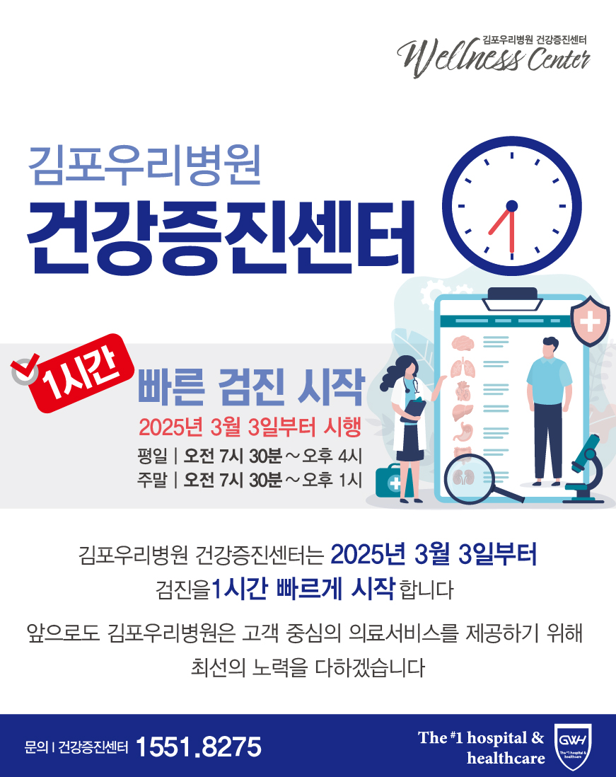 김포우리병원 건강증진센터는 2025년 3월 3일부터 검진을 1시간 빠르게 시작합니다. 앞으로도 김포우리병원은 고객 중심의 의료서비스를 제공하기 위해 최선의 노력을 다하겠습니다 ![]() |