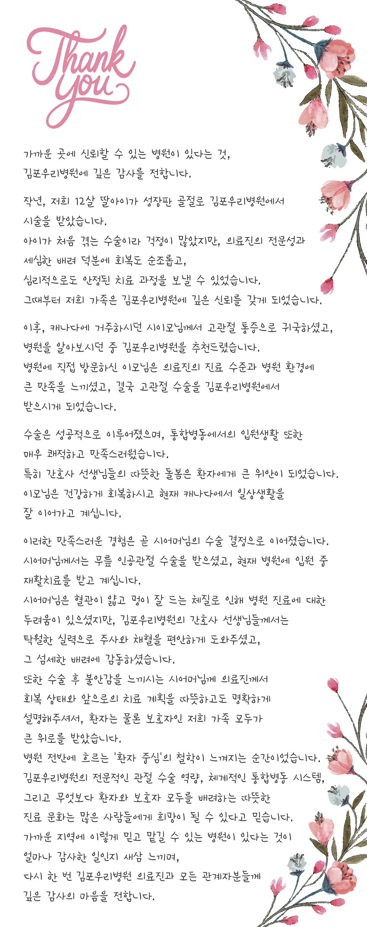 고객 여러분의 따뜻한 성원과 진심 어린 격려에 깊이 감사드립니다. 김포우리병원은 앞으로도 환자 중심의 의료 서비스를 지속적으로 강화하여, 더 많은 환자 여러분의 몸과 마음을 치유하는 신뢰받는 의료기관으로 나아가겠습니다. 진심으로 감사드립니다. |