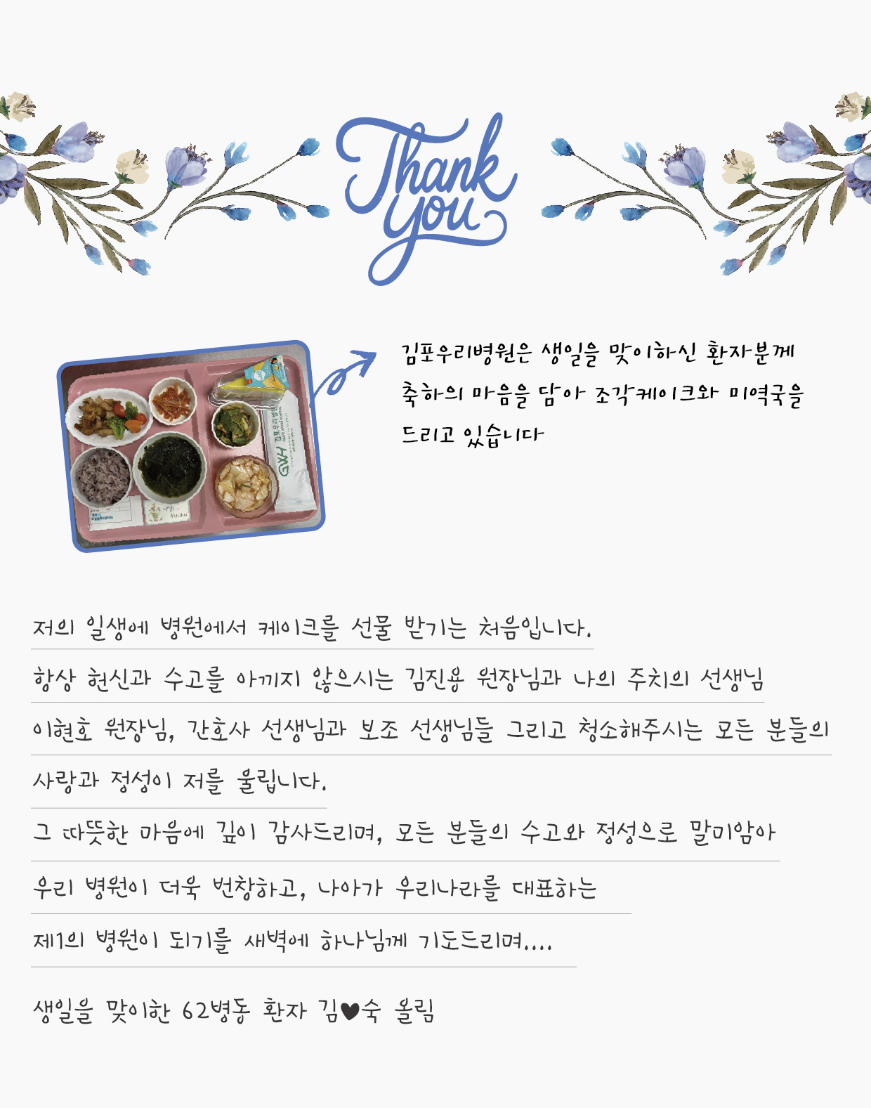 김포우리병원에 감사한 마음을 담아 전하는 편지 ![]() 김포우리병원은 앞으로도 환자 중심의 의료 서비스를 지속적으로 강화하여, 더 많은 환자 여러분의 몸과 마음을 치유하는 신뢰받는 의료기관으로 나아가겠습니다. 진심으로 감사드립니다. |