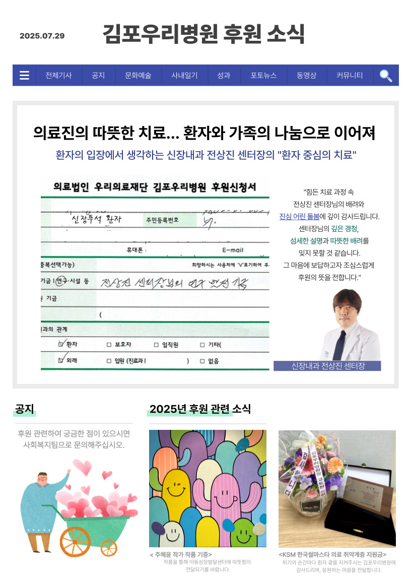 의료진의 따뜻한 치료, 환자와 가족의 나눔으로 이어지다 ------- 김포우리병원 신장내과 전상진 센터장님은 언제나 환자 중심의 치료를 실천하며, 환자의 입장에서 생각하는 진료를 이어가고 있습니다. 최근 치료를 마친 환자분과 가족께서 깊은 감사의 마음을 담아 소중한 후원을 전달해주셨습니다. "힘든 치료 과정 속 전상진 센터장님의 배려와 진심 어린 돌봄에 깊이 감사드립니다. 센터장님의 깊은 경청, 섬세한 설명과 따뜻한 배려를 잊지 못할 것 같습니다. 그 마음에 보답하고자 조심스럽게 후원의 뜻을 전합니다." 김포우리병원은 앞으로도 환자 한 분 한 분의 마음을 소중히 여기며, 따뜻한 치료와 돌봄을 이어가겠습니다