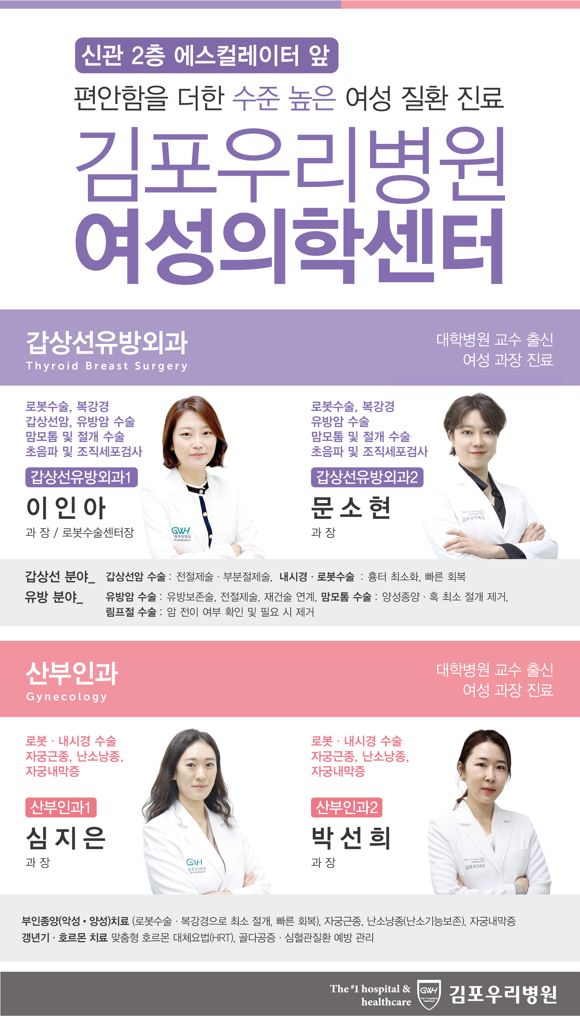 김포우리병원 여성의학센터는 갑상선·유방암, 부인과 질환 등 여성 질환 관련 과들로 구성된 통합 진료 센터로 가장 효과적인 수술 치료는 물론 숙련된 의료진들과 다학제간 진료를 통해 수준 높은 의료 서비스를 제공하고 있습니다