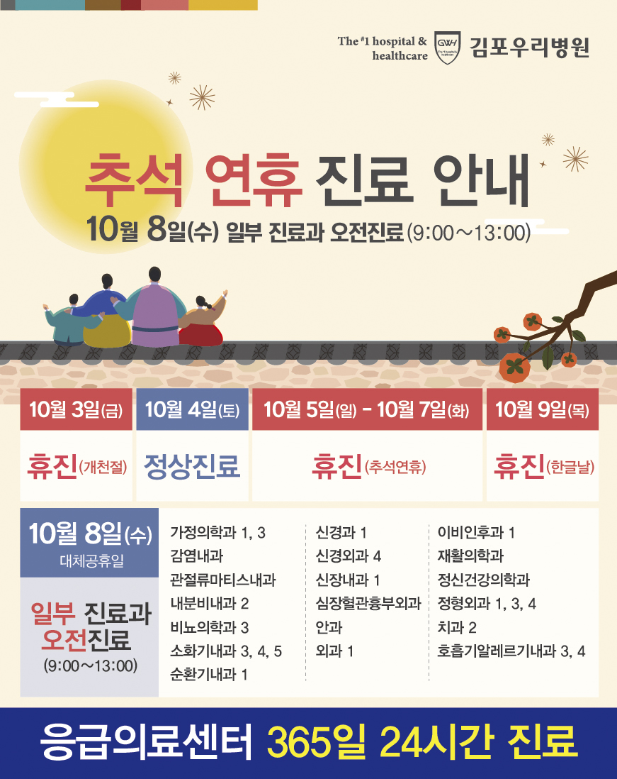 ※ 10월 8일(대체휴일) 김포우리병원 건강증진센터, 건강검진 시행! 평일 검진이 어려우셨다면, 이번 대체공휴일에 건강 챙기세요. |