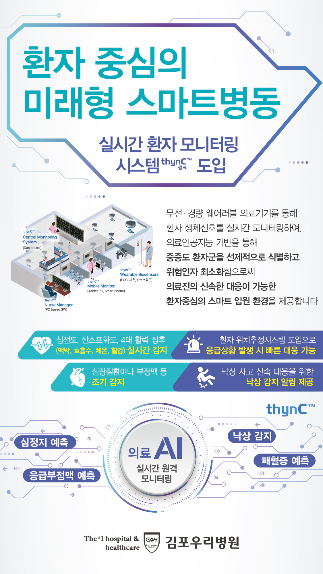 무선·경량 웨어러블 의료기기를 통해 환자 생체신호를 실시간 모니터링하여, 의료인공지능 기반을 통해 중증도 환자군을 선제적으로 식별하고 위험인자 최소화함으로써 의료진의 신속한 대응이 가능한 환자중심의 스마트 입원 환경을 제공합니다 ![]() |