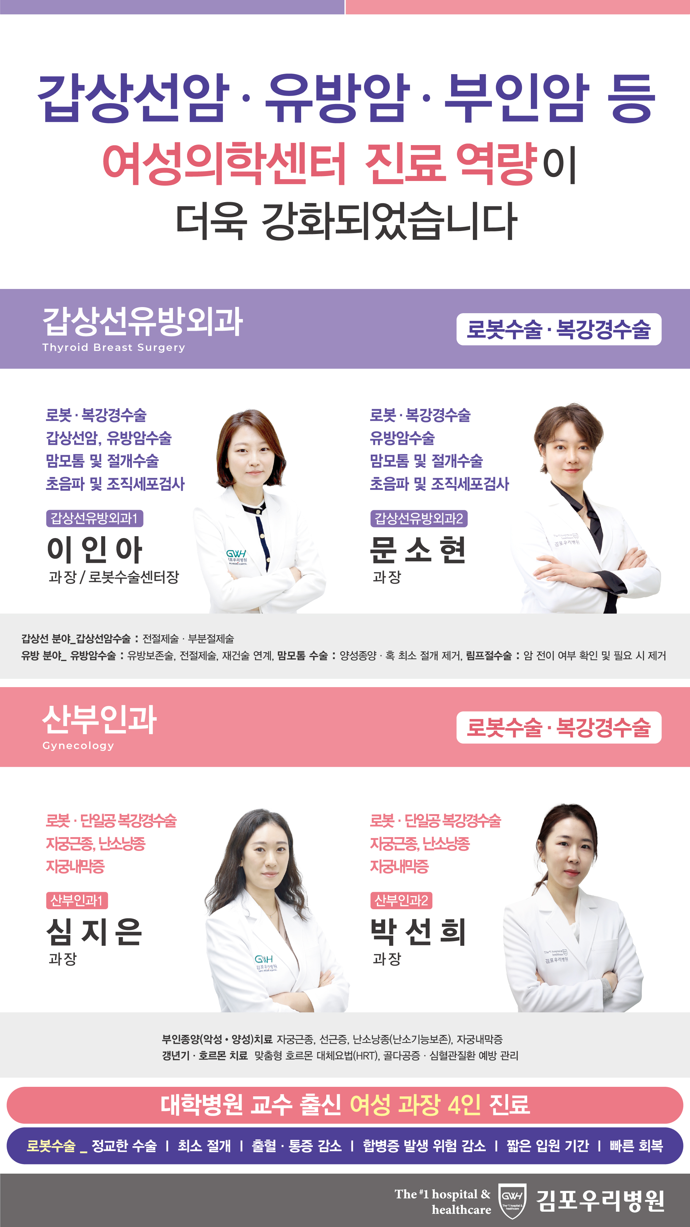 김포우리병원 여성의학센터는 갑상선암 ·유방암, 부인암 등 여성 질환 관련 과들로 구성된 통합 진료 센터로 가장 효과적인 수술 치료는 물론 숙련된 의료진들과 다학제간 진료를 통해 수준 높은 의료 서비스를 제공하고 있습니다